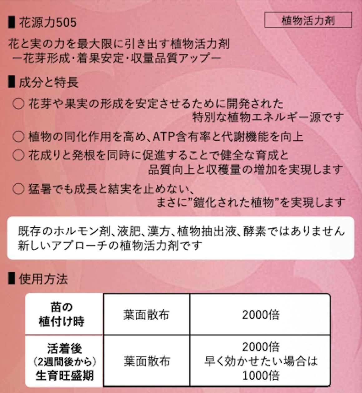 そんな花の悩みを解決するために作られたのが 花源力505 です。
